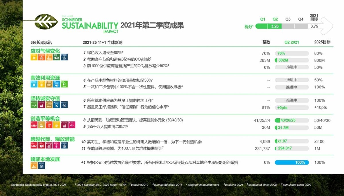 “2021-2025施耐德电气可持续发展影响指数(SSI)计划”今年第二季度的成果和亮点包括: